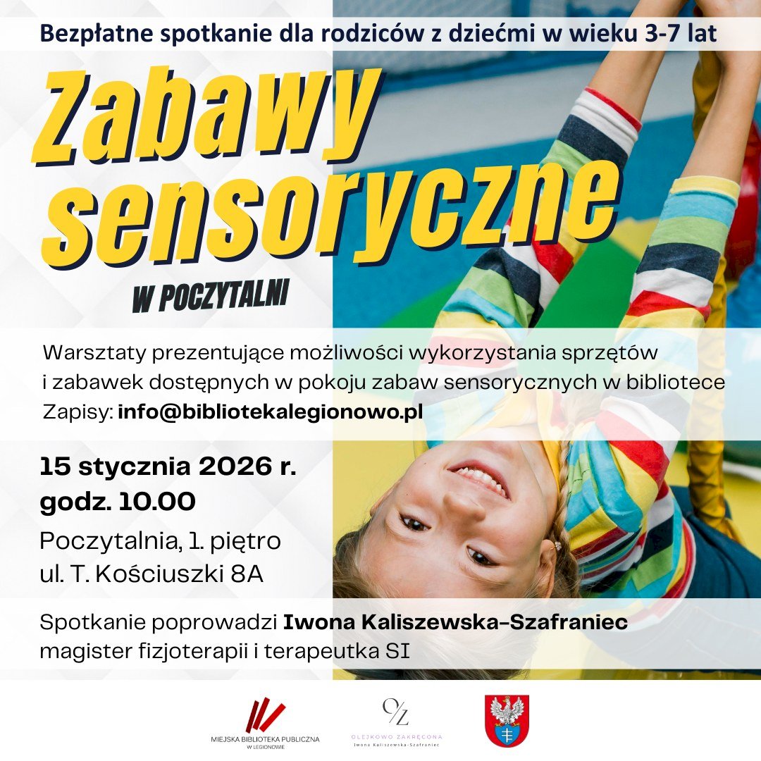 Miejska Biblioteka Publiczna w Legionowie zaprasza rodziców z dziećmi w wieku 3–7 lat na praktyczne warsztaty, podczas których pokażemy, jak świadomie korzystać z wyposażenia i zabawek dostępnych w pokoju zabaw sensorycznych w bibliotece, aby poprzez zabawę wspierać rozwój dziecka.
