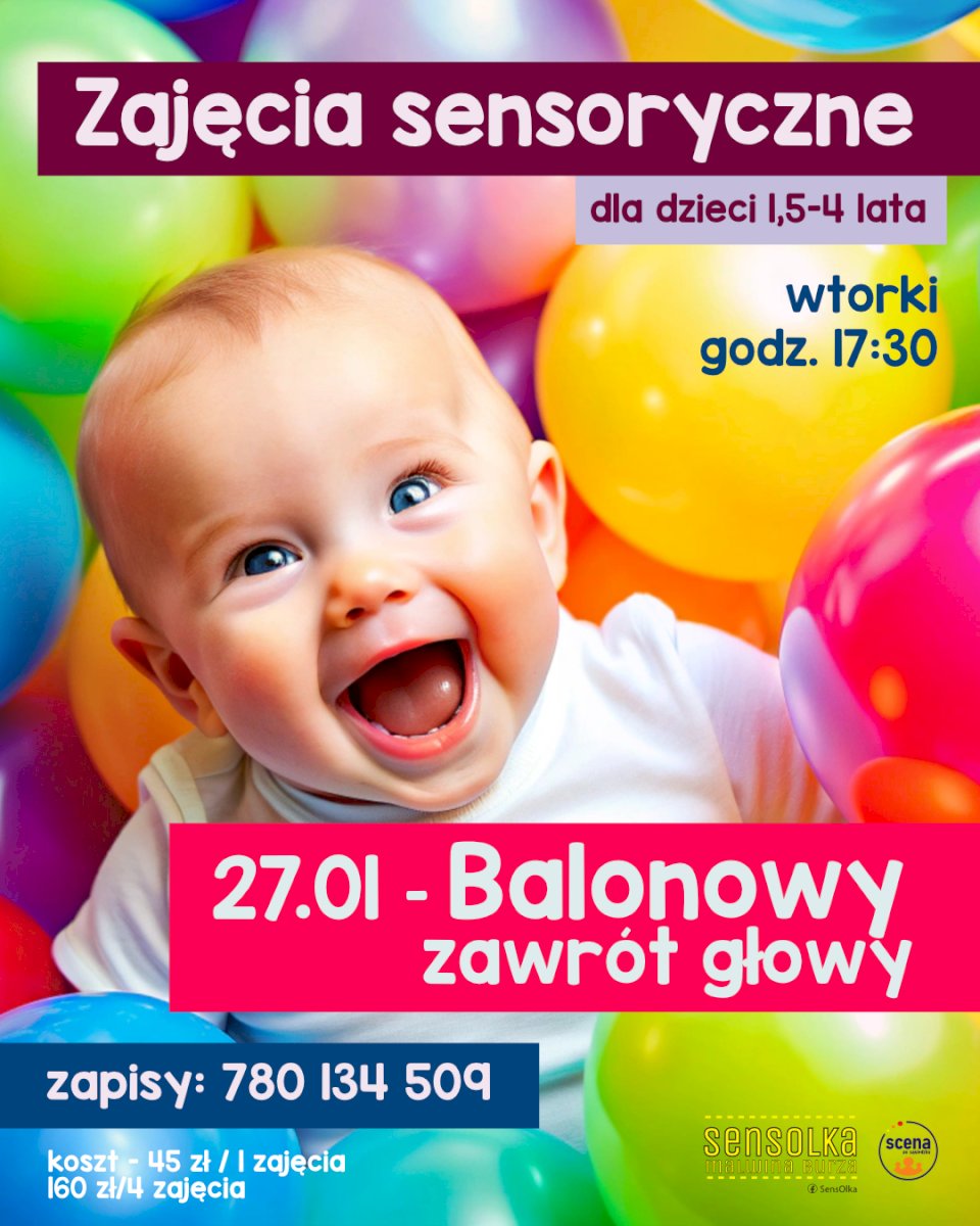 Skierowane do dzieci w wieku od 1,5 do 4 lat. Radosne zajęcia sensoryczne pełne kolorów, ruchu i zabawy. Tym razem motywem przewodnim będzie „Balonowy zawrót głowy” – doświadczenia pobudzające zmysły i wspierające rozwój przez aktywną eksplorację.