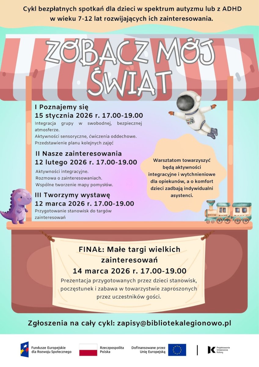 Miejska Biblioteka Publiczna w Legionowie zaprasza dzieci w spektrum autyzmu lub z ADHD (7–12 lat) wraz z rodzicami do udziału w cyklu spotkań integracyjno-warsztatowych „Zobacz mój świat”. Dzieci, przy wsparciu asystentów, będą miały możliwość integracji, rozmowy o swoich zainteresowaniach oraz zaprezentowania swoich pasji. W tym samym czasie rodzice będą mogli odpocząć i nawiązać nowe kontakty. Warsztaty poprowadzi ADHD Mermaid.
