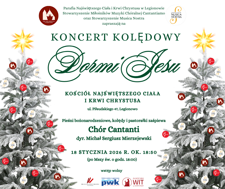W Kościele Najświętszego Ciała i Krwi Chrystusa w Legionowie ul. Piłsudskiego 47 odbędzie się koncert kolędowy. Będzie można usłyszeć pieśni bożonarodzeniowe, kolędy i pastorałki.
