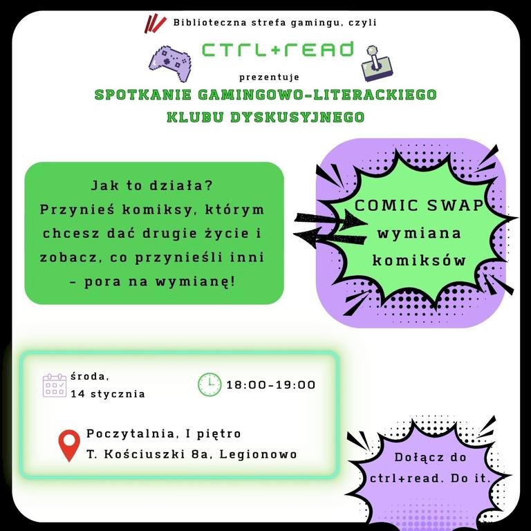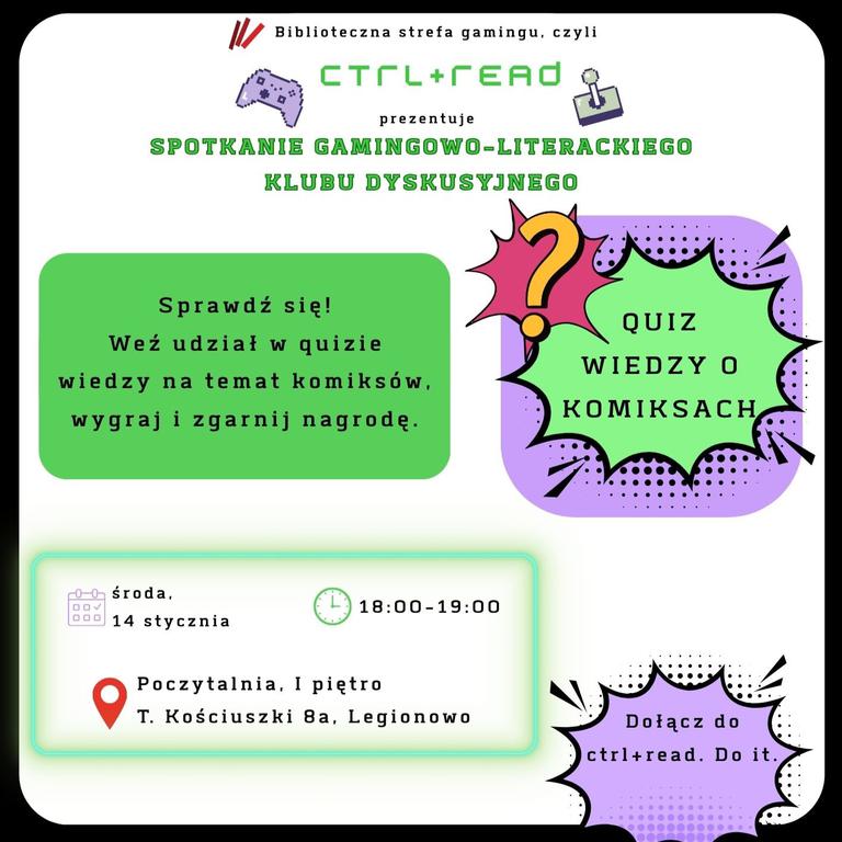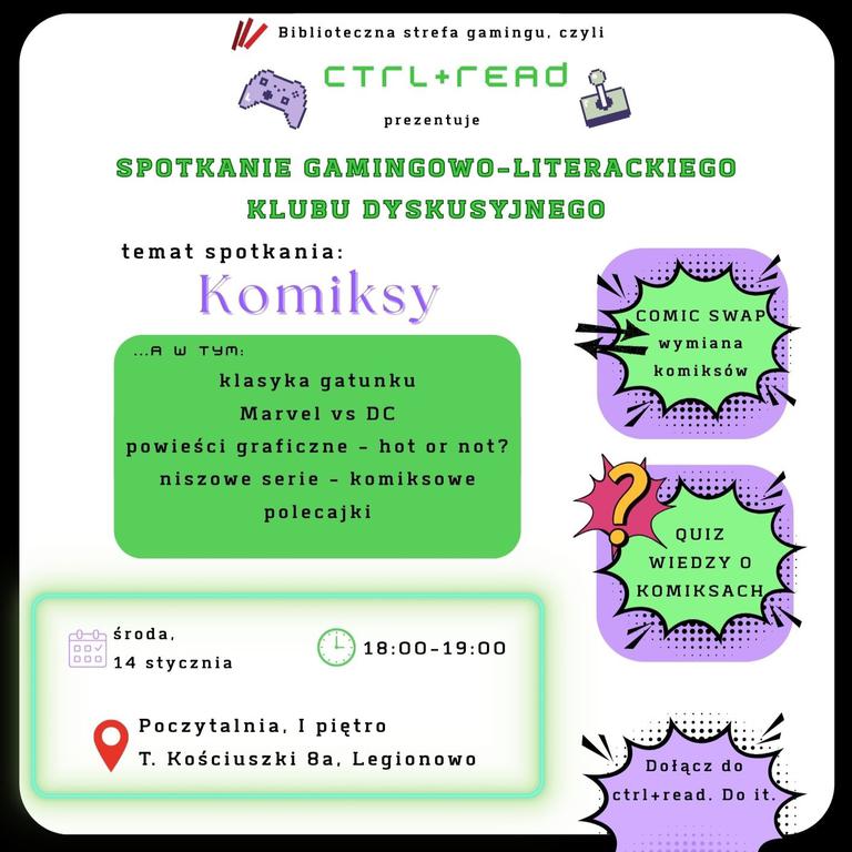 Zapraszamy na spotkanie poświęcone komiksom: rozmowy o ulubionych seriach i bohaterach, polecajki niszowych tytułów, dyskusje o powieściach graficznych, wymianę komiksów oraz quiz z nagrodami.