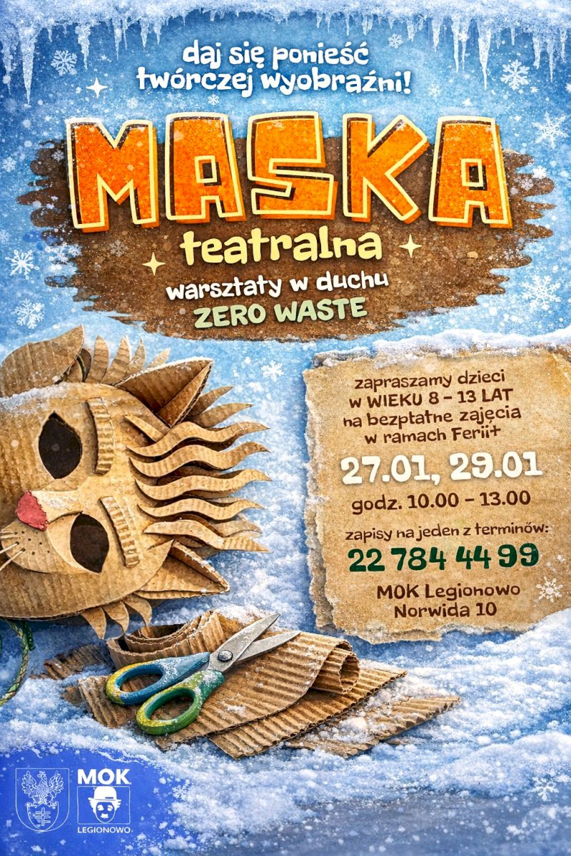 Miejski Ośrodek Kultury w Legionowie zaprasza dzieci w wieku 8–13 lat na bezpłatne warsztaty teatralno-plastyczne podczas ferii zimowych. Uczestnicy stworzą autorskie maski teatralne z materiałów z odzysku, rozwijając wyobraźnię, kreatywność i świadomość ekologiczną w duchu zero waste.