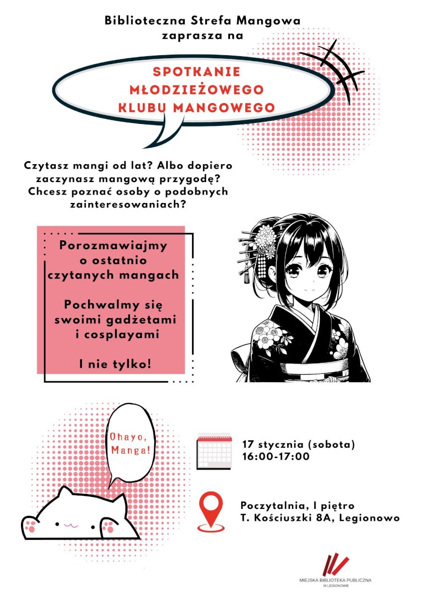 Na spotkanie Młodzieżowego Klubu „Ohayo, Manga!” zaprasza Miejska Biblioteka Publiczna w Legionowie. Zapraszamy miłośników mangi, anime oraz kultury japońskiej – zarówno tych z wieloletnim doświadczeniem, jak i osoby dopiero rozpoczynające swoją przygodę. Klub „Ohayo, Manga!” to przestrzeń do spotkań, rozmów i wymiany pasji z osobami o podobnych zainteresowaniach.