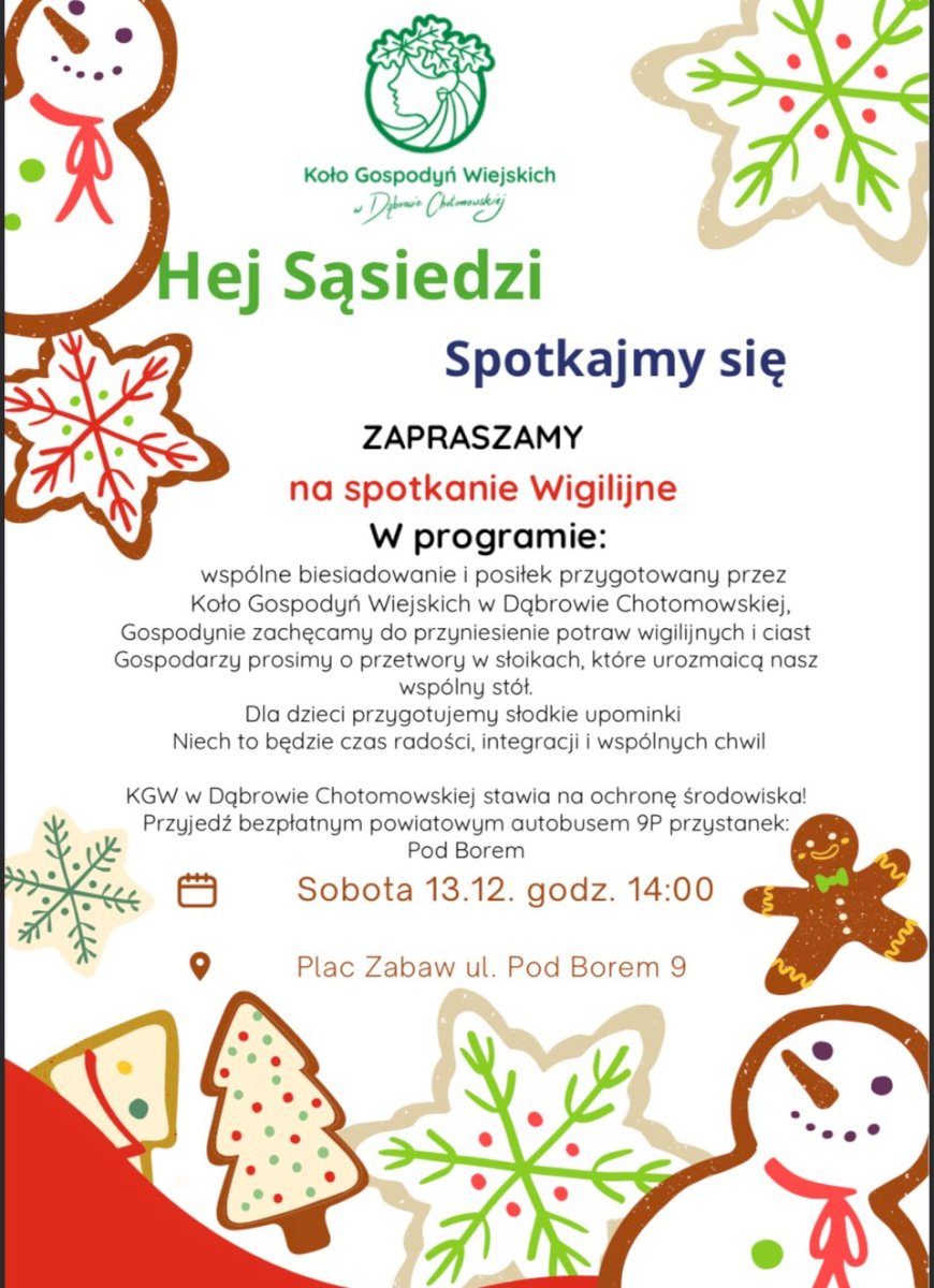 Koło Gospodyń Wiejskich w Dąbrowie Chotomowskiej zaprasza na wspólne, świąteczne spotkanie mieszkańców Dąbrowy Chotomowskiej. Wydarzenie rozpocznie się wraz z przybyciem proboszcza z parafii p.w. Wniebowzięcia NMP w Chotomowie.