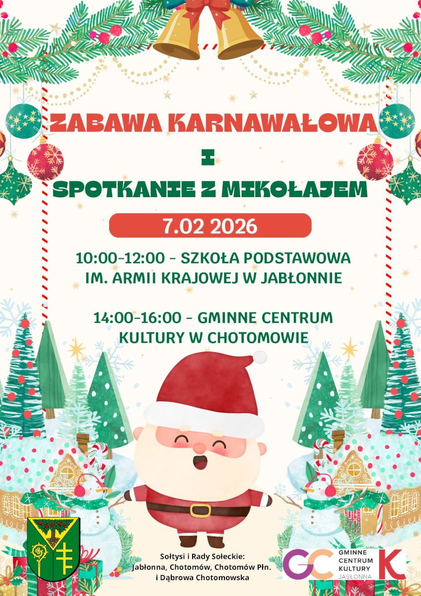 Na zabawę karnawałową i spotkanie z mikołajem zapraszają Gminne Centrum Kultury w Jabłonnie, sołtysi i rady sołeckie: Jabłonna, Chotomów, Chotomów Północny i Dąbrowa Chotomowska