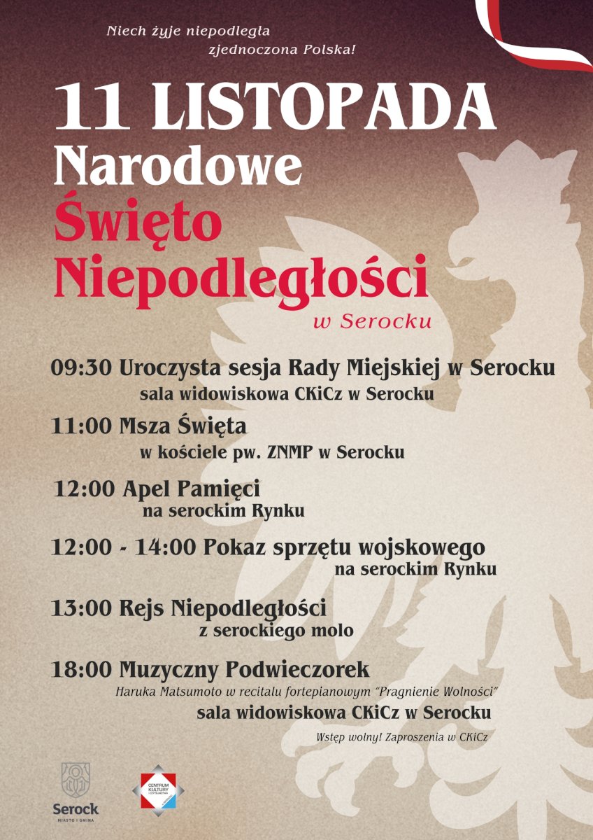 - 09:30 Uroczysta sesja Rady Miejskiej w Serocku w sali widowiskowej CKiCz w Serocku