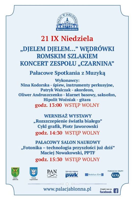 godz. 13:00 – koncert zespołu „Czarnina” pt. „Djelem Djelem... Wędrówki romskim szlakiem”.