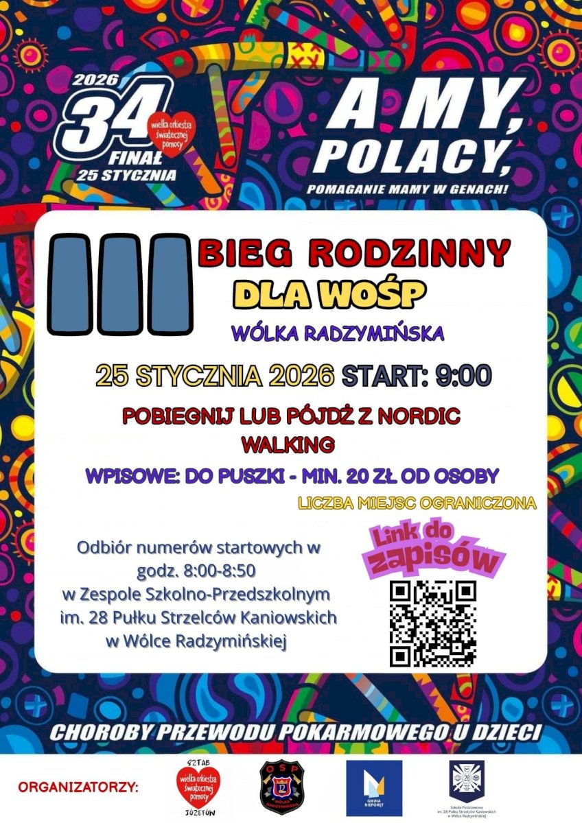 Sztab WOŚP Gminy Nieporęt zaprasza dzieci, dorosłych i całe rodziny do udziału w Biegu Rodzinnym dla WOŚP, organizowanym w ramach 34. Finału Wielkiej Orkiestry Świątecznej Pomocy.