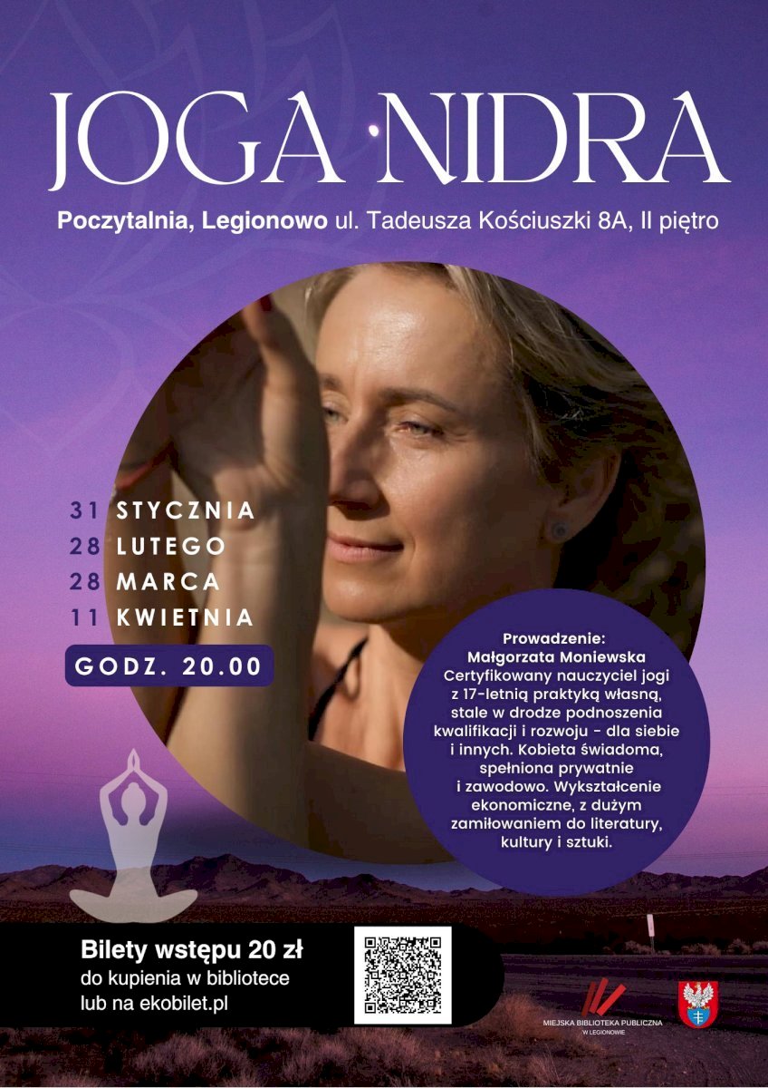 Zajęcia poprowadzi Małgorzata Moniewska – certyfikowana nauczycielka jogi z 17-letnim doświadczeniem własnej praktyki, nieustannie rozwijająca swoje kompetencje. Osoba świadoma, spełniona zawodowo i prywatnie, z wykształceniem ekonomicznym oraz pasją do literatury, kultury i sztuki. Joga nidra to głęboka praktyka relaksacyjna wykonywana w pozycji leżącej, prowadząca do harmonii ciała, emocji i umysłu. Opisywana jest jako stan pomiędzy czuwaniem a snem