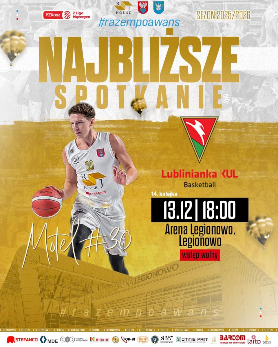 Już w sobotę, 13 grudnia 2025 roku o godz. 18:00, w Arenie Legionowo, nasz zespół RJ House Legion Legionowo rozegra mecz 14. kolejki sezonu 2025/2026 przeciwko Lublinianka KUL Basketball.