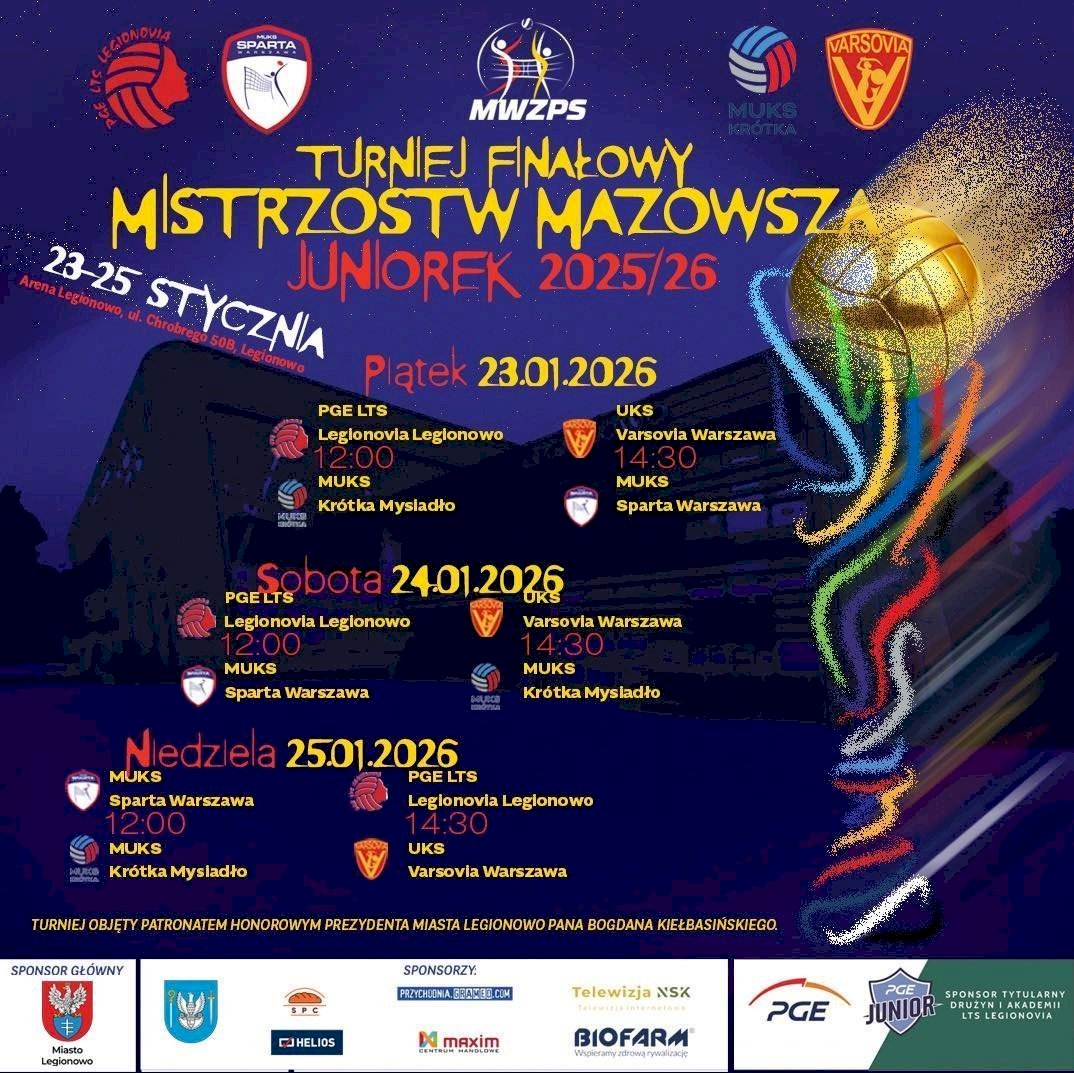 W dniach 23–25 stycznia w Arenie Legionowo odbędzie się Turniej Finałowy Mistrzostw Mazowsza Juniorek. Przed nami trzy dni sportowych emocji i rywalizacji najlepszych zespołów regionu. Turniej objęty jest honorowym patronatem Prezydenta Miasta Legionowo.