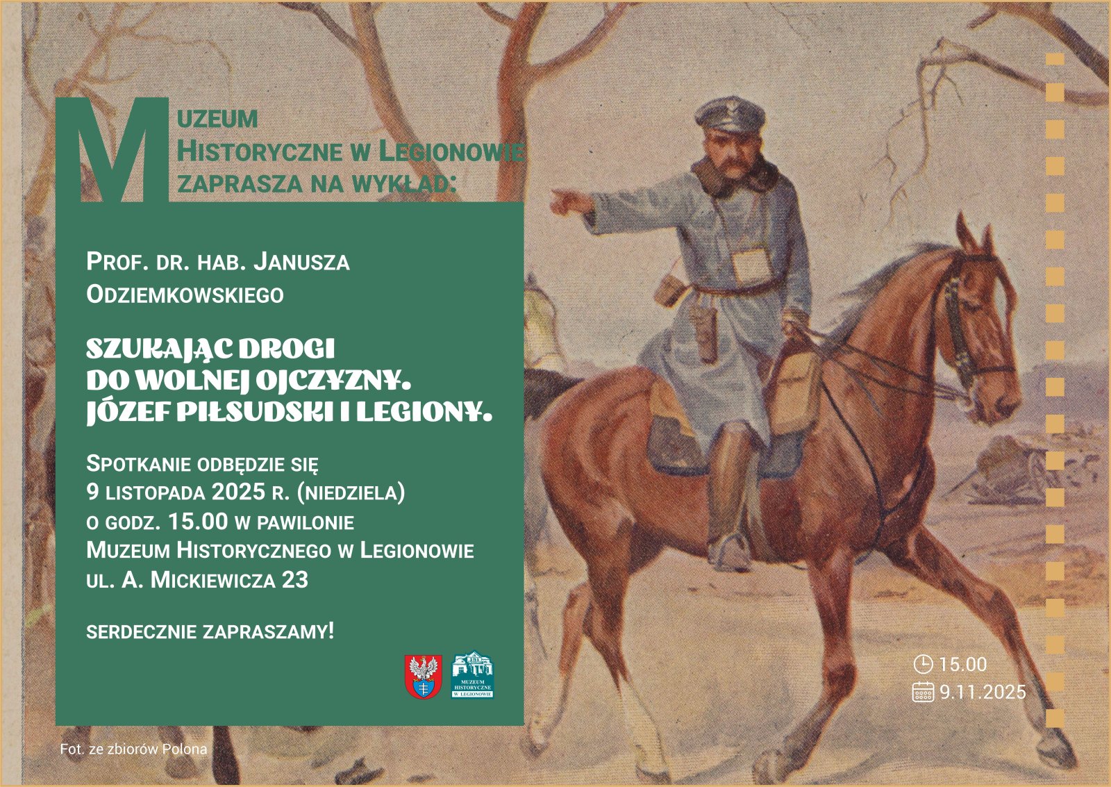 Muzeum Historyczne w Legionowie zaprasza na wykład prof. dr. hab. Janusza Odziemkowskiego pt. „Szukając drogi do wolnej Ojczyzny. Józef Piłsudski i Legiony” - 9 listopada 2025 r. (niedziela), o godz. 15.00, pawilon muzealny, ul. A. Mickiewicza 23. Wstęp wolny.