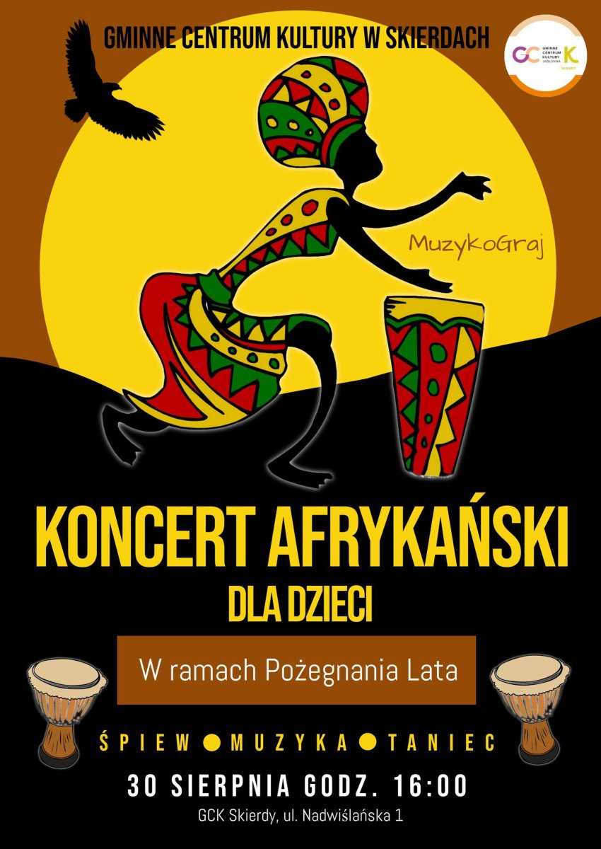 Gminne Centrum Kultury w Skierdach w ramach pożegnania lata zaprasza dzieci wraz z opiekunami na szolone tańce w afrykańskich rytmach.