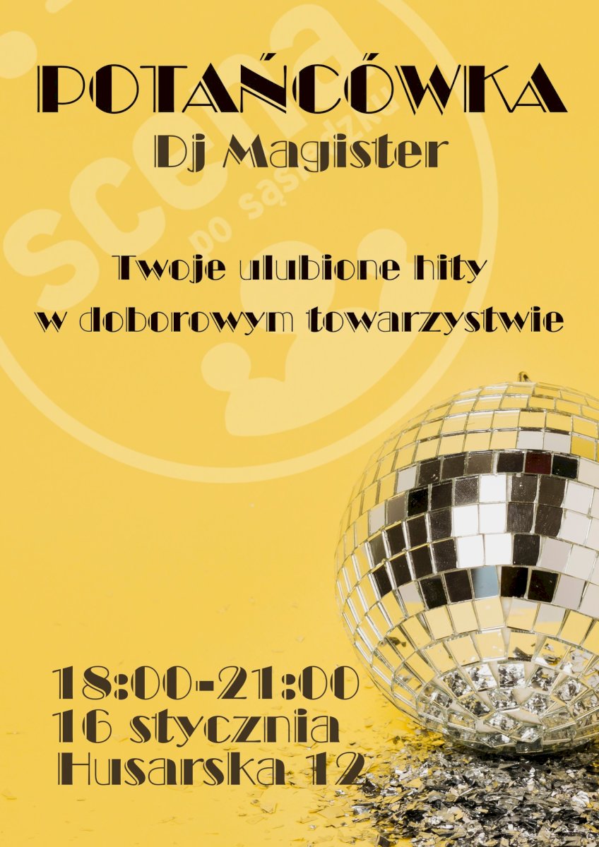 Grafika z żółtym tłem i kulą dyskotekową znajdującą się w prawnym dolnym rogu
