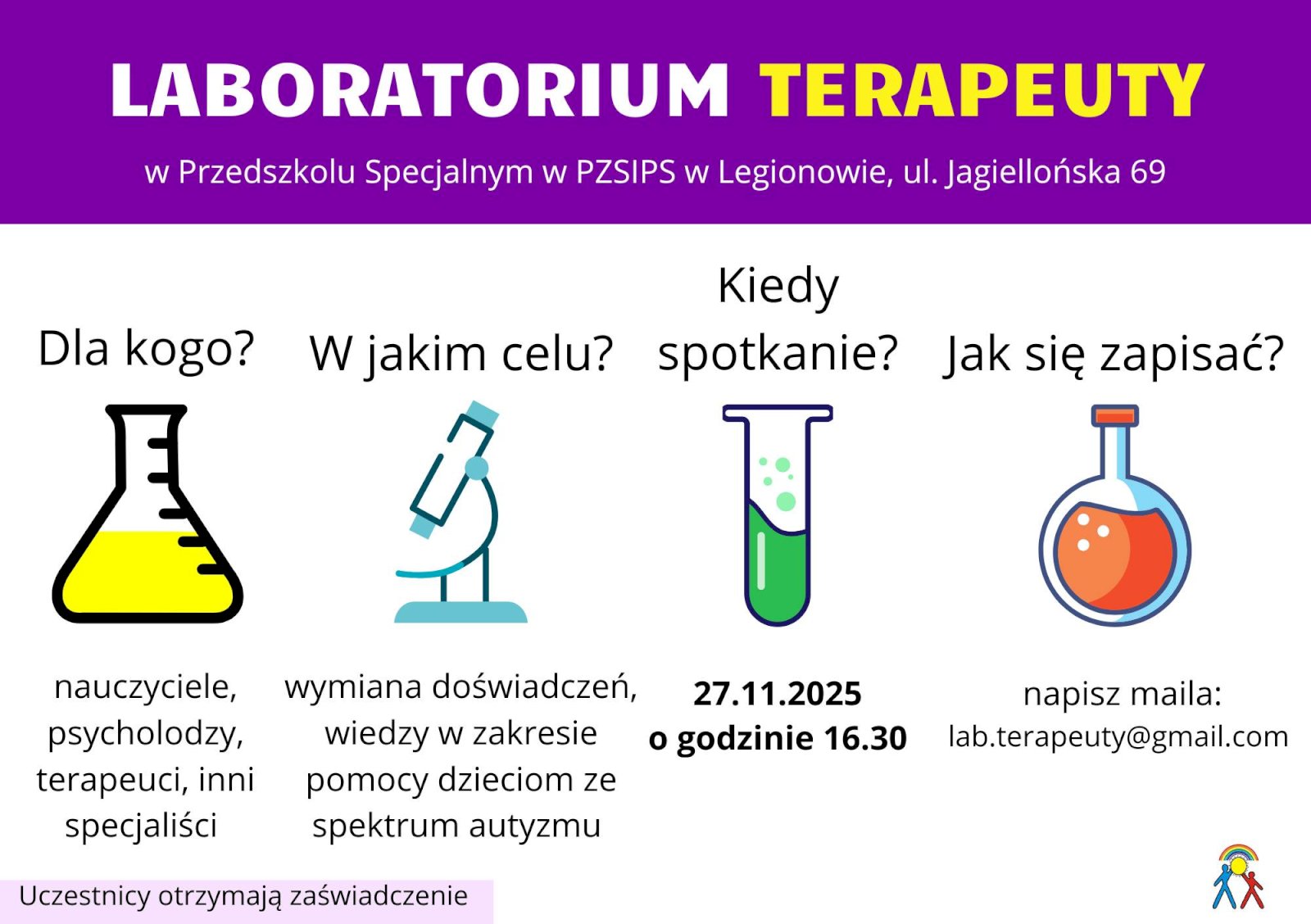 W imieniu organizatorów zapraszamy dyrektorów, psychologów, nauczycieli, logopedów oraz innych specjalistów na Laboratorium Terapeuty, które odbędzie się 27 listopada o godz. 16:30 w Przedszkolu Specjalnym w PZSiPS w Legionowie, ul. Jagiellońska 69.