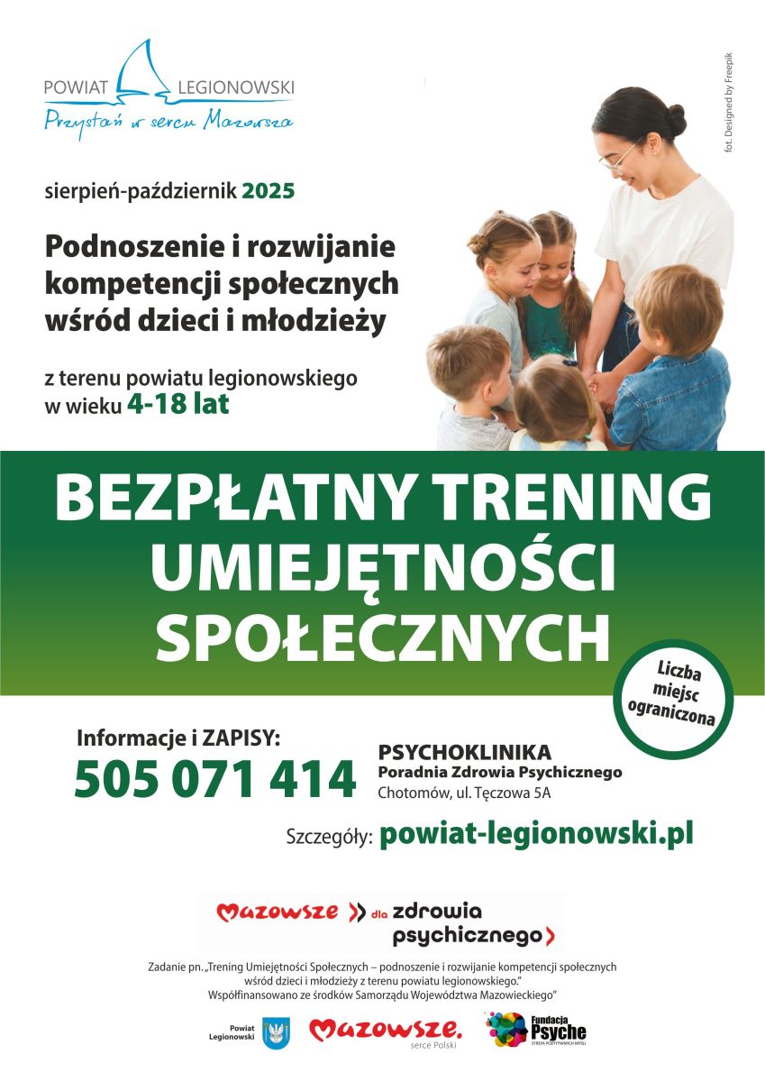 Zadanie „Trening Umiejętności Społecznych – podnoszenie i rozwijanie kompetencji społecznych wśród dzieci i młodzieży z terenu powiatu legionowskiego” realizowane jest w ramach Samorządowego Instrumentu Wsparcia Zdrowia Psychicznego „Mazowsze dla Zdrowia Psychicznego 2025”.